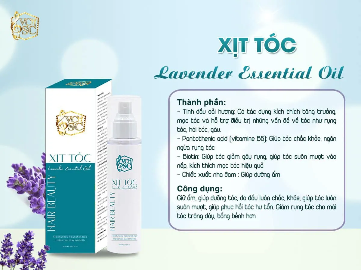 • Tinh dầu Oải Hương (Lavender Oil): Có tác dụng kích thích tăng trưởng, giúp mọc tóc nhanh và hỗ trợ giải quyết các vấn đề như rụng tóc, hói đầu và gàu.